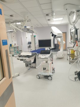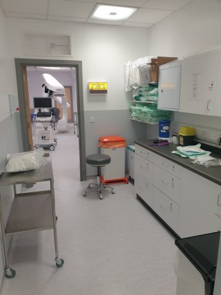 Inset middle: The ‘box’. If you are ‘running’ for a theatre you sit here and prepare anything that might plausibly be required during a procedure in case someone in the room asks for it. It’s relatively simple to run for a specialised room like this, but in main theatres it is extremely complicated and requires skill, speed, and detailed knowledge.