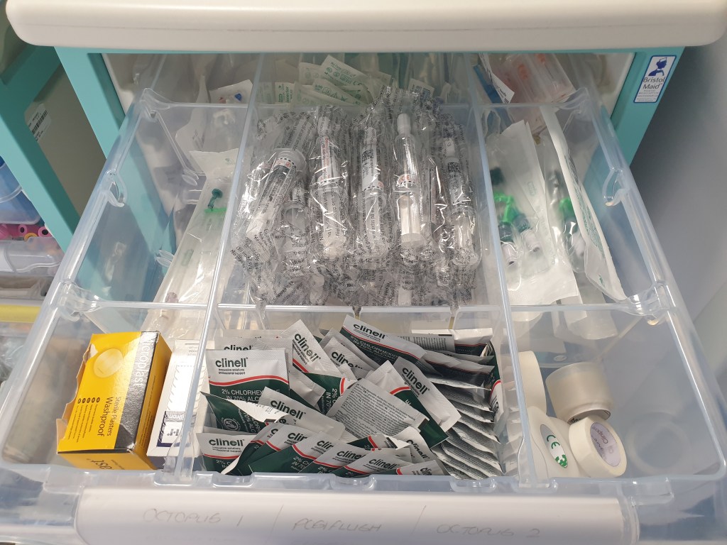 Main: Sundry cannulation equipment, including three-way taps, bionectors, flushes, Octopus singles and doubles – I usually like to say that this is a tennis tournament when discussing with patients, or that Octopus singles is a dating app – sterile wipes, tape etc.